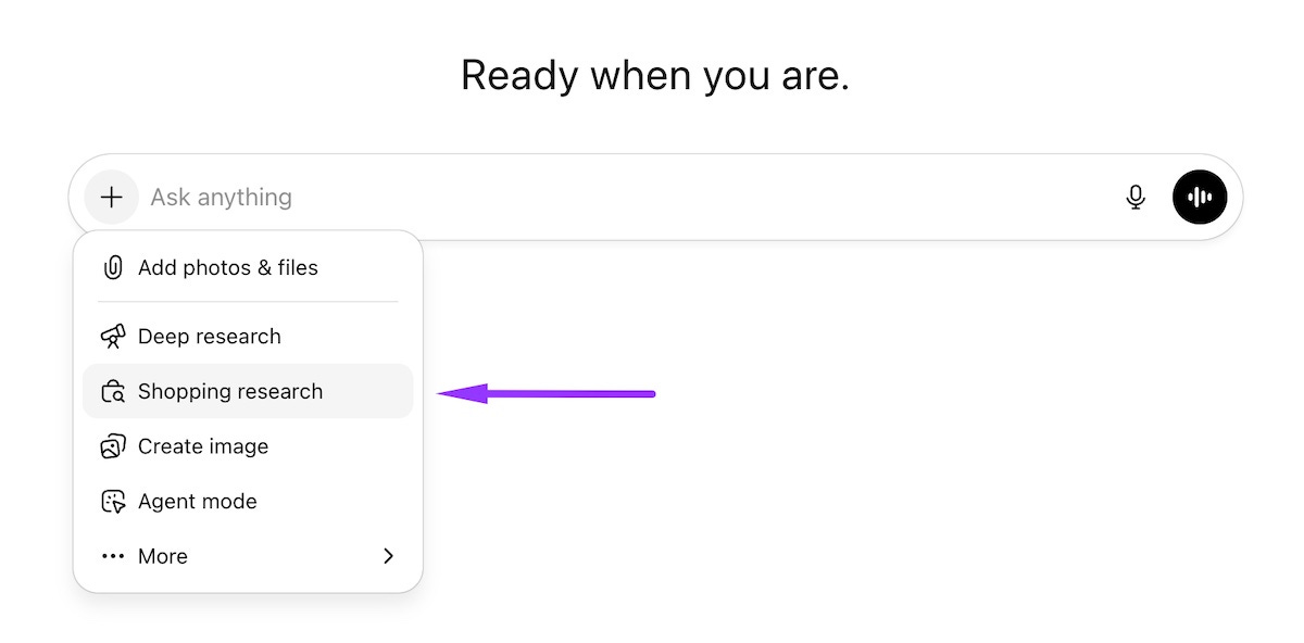 The ChatGPT Shopping Research mode is triggered when a user explicitly selects the corresponding option in the prompt’s input field: