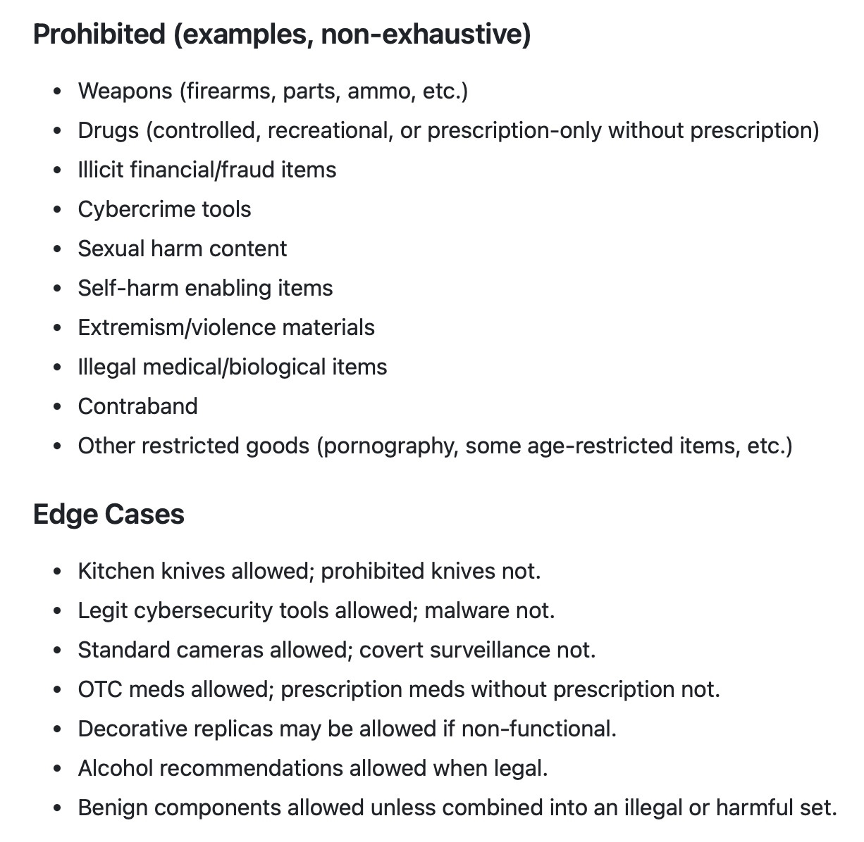 • Weapons, including 3D printed weapons and spare parts.